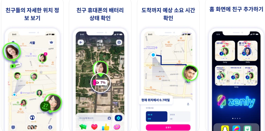 구글 지도를 기반으로 주변 지인들의 위치를 실시간으로 확인할 수 있는 애플리케이션입니다. 스냅챗으로 유명한 스냅이 인수한 것으로 알려져 있으며, 젠리만 등록하게 되면 기능을 바로 사용할 수 있습니다. 편리한 점은 카카오톡 연락처, 페이스북 메신저 연락처를 연동해서 사용할 수 있다는 장점이 있습니다. 해당 앱 같은 경우에는 국내에서만 1백만 명이 가입한 것으로 확인되었으며, 대부분 연령대는 10대인 것으로 확인되었습니다. 젠리을 사용하는 친구들끼리 만나면 범프를 사용하게 되면 친구들과 만남을 가졌다는 내용을 바로 확인할 수 있습니다. 다만, 코로나 19 상태로 인해서 현재는 비활성화가 되었지만, 곧 사용할 수 있을 것으로 보입니다.