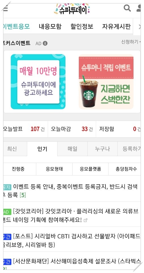 재테크 어플 중 인기가 있는 앱테크인 슈터투데이에 대해서 한번 알아보겠습니다. 슈퍼투데이는 이벤트, 할인정보, 쿠폰 등 다양한 이벤트를 통해서 사람들에게 저렴한 정보를 제공하는 재테크 어플입니다. 적립받을 수 있는 금액대는 차이가 날 수 있는 있겠지만, 100% 당첨 이벤트, 누구나 응모 이벤트, 선착순 응모 이벤트 등 많은 이벤트를 제공하고 있습니다.