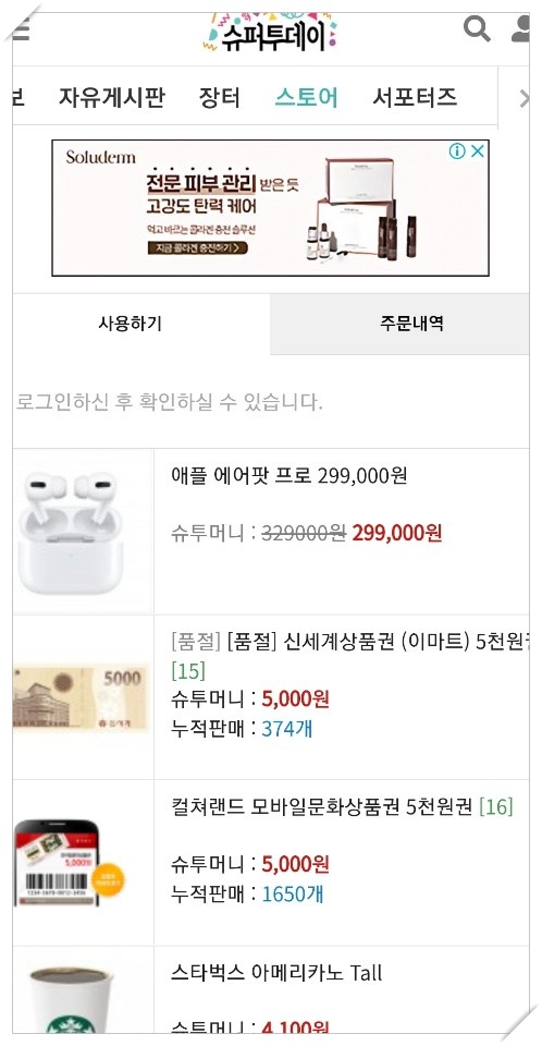스토어 내에서 본인이 원하는 상품을 구입할 수 있습니다. 출석체크, 이벤트 등록, 참여하기, 사전 등록을 통해서 받은 슈퍼투데이 머니로 이용가능 할 수 있습니다. 제품에 따라서 차이는 있지만, 애플 에어팟, 상품권 등이 있습니다.
