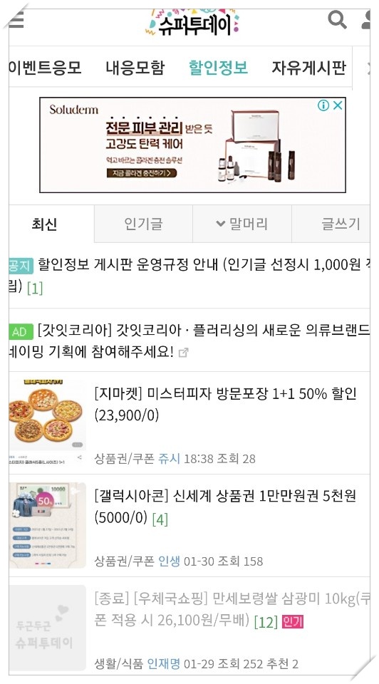 온라인 내에서 판매되고 있는 국내외 할인 정보를 바로 확인할 수 있습니다. 할인정보 내에서 인기글 선정 시, 500원이 적립되며 스토어 내에서 E쿠폰 또는 장터에서 사용할 수 있는 장점이 있습니다.