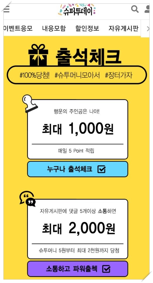슈퍼투데이 이벤트 응모, 할인정보, 장터, 스토어운영, 출석체크