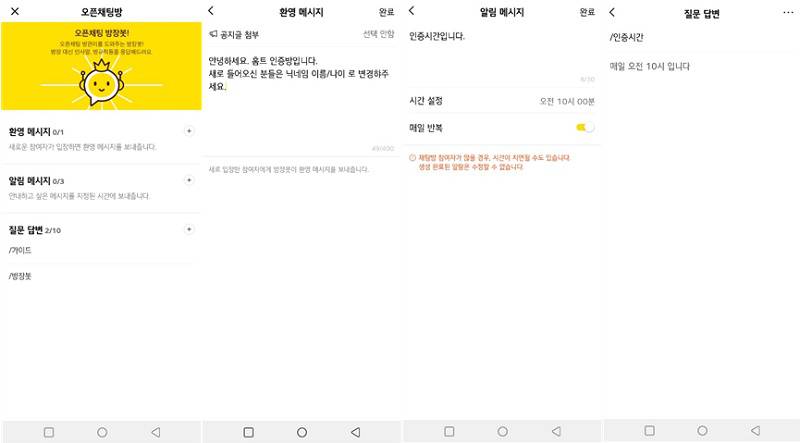 방장봇의 기능은 오픈채팅방의 방장만 설정 가능하며 채팅방 내 우측 상단의 사이드 메뉴를 통해서 오픈채팅빙 방장봇 활성화를 클릭하여 사용할 수 있습니다. 설정 버튼을 눌러 환영메서지와 알림 메세지, 질문 및 답변 등을 생생할 수 있고, 수정과 삭제도 간편하게 진행할 수 있습니다.