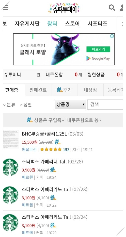 기본적으로 판매되는 가격보다 20~30% 저렴한 금액으로 구매할 수 있는 정보입니다. 회원 간 내에 장터 거래도 가능하며 쿠폰을 구입하게 되면 내 쿠폰함에 바로 저장되어서 사용할 수 있습니다.